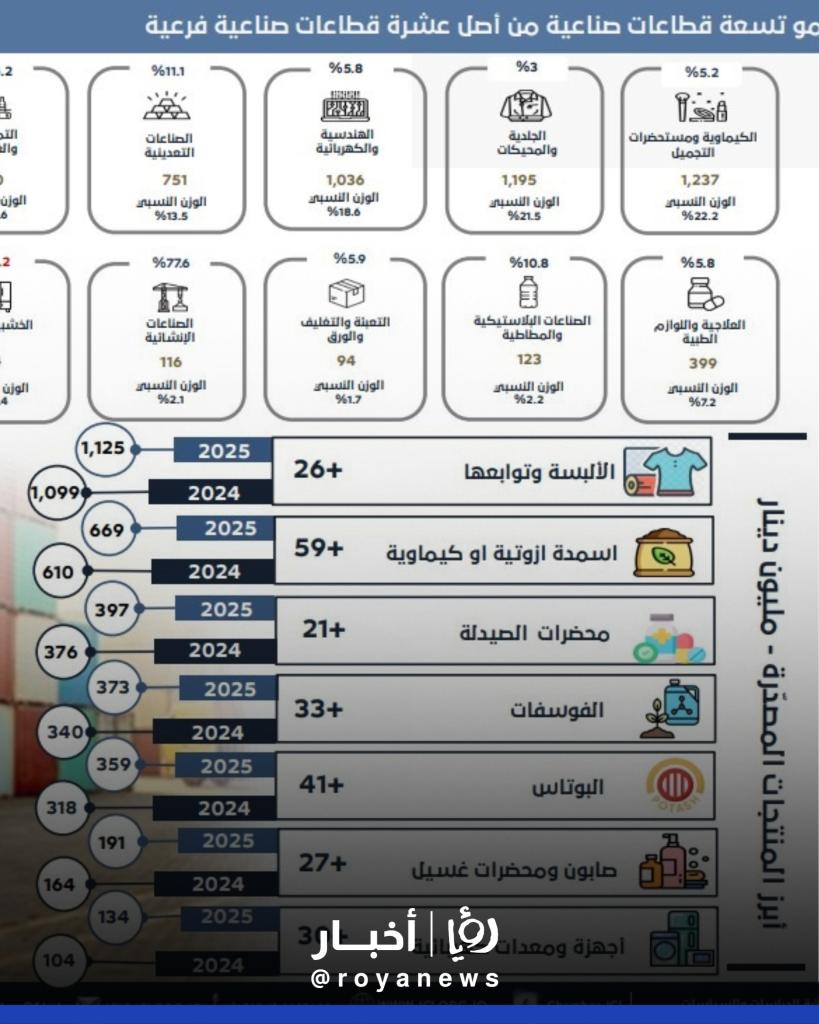 وأوضحت غرفة صناعة الأردن أن هذا الأداء الإيجابي يعكس مرونة الصناعة الوطنية وقدرتها على التكيف مع الظروف الاقتصادية العالمية، خاصة في ظل تباطؤ الطلب في بعض الأسواق وتذبذب أسعار المواد الخام والطاقة.